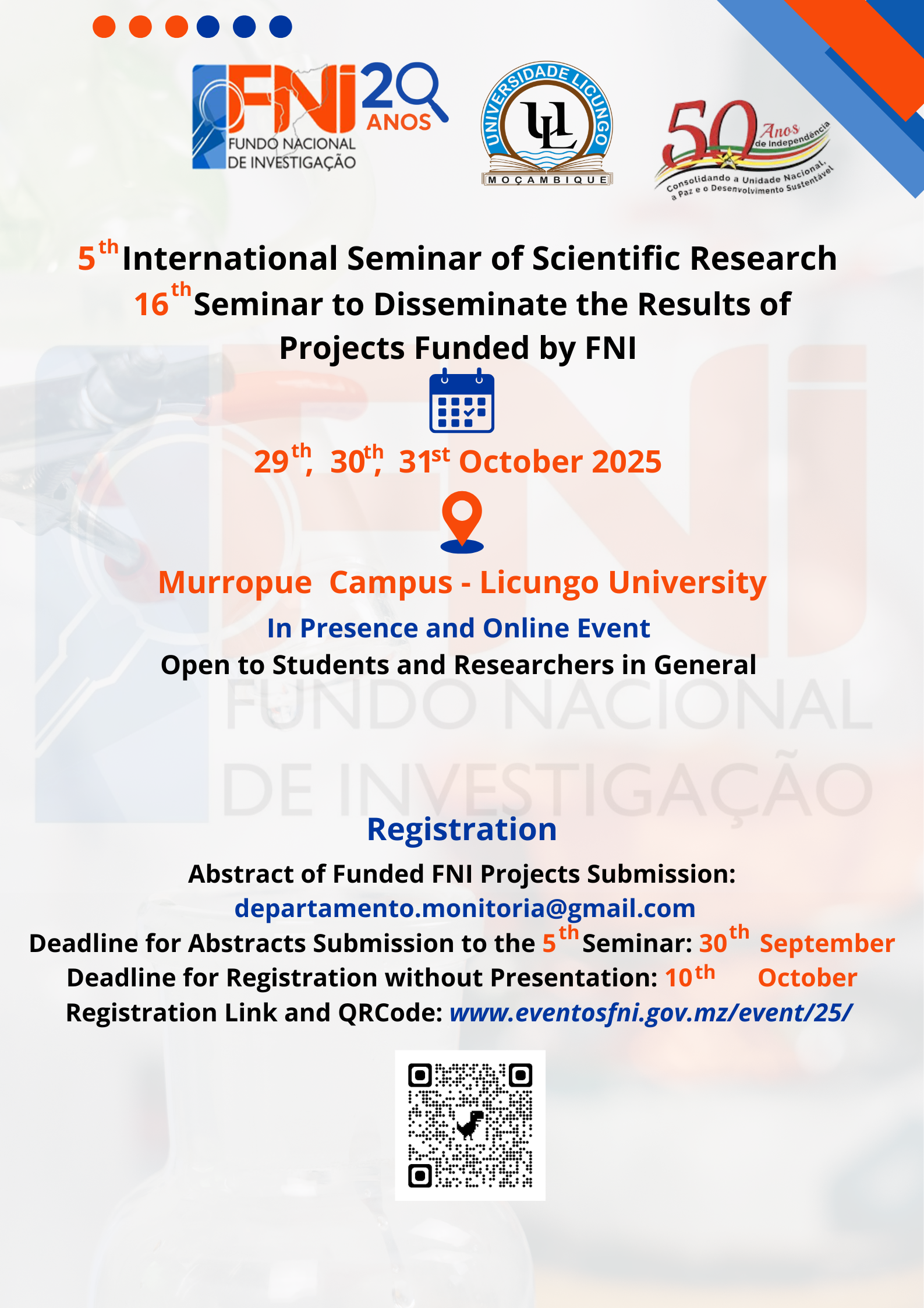 NoticiasEventos 5th International Seminar of Scientific Research & 16th Seminar to Disseminate the Results of Projects Funded by FNI 197 https://eventos.fni.gov.mz/event/25