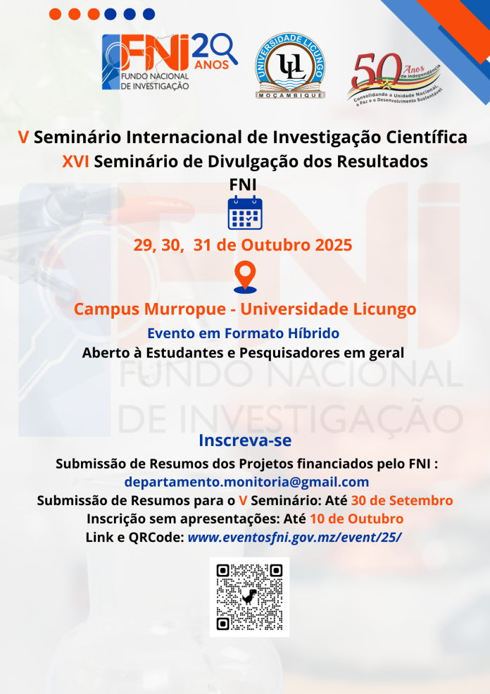 NoticiasEventos V Seminário Internacional de Investigação Cientifica e XVI Seminário de Divulgação dos Resultados dos Projectos Financiados Pelo FNI 290 https://eventos.fni.gov.mz/event/25